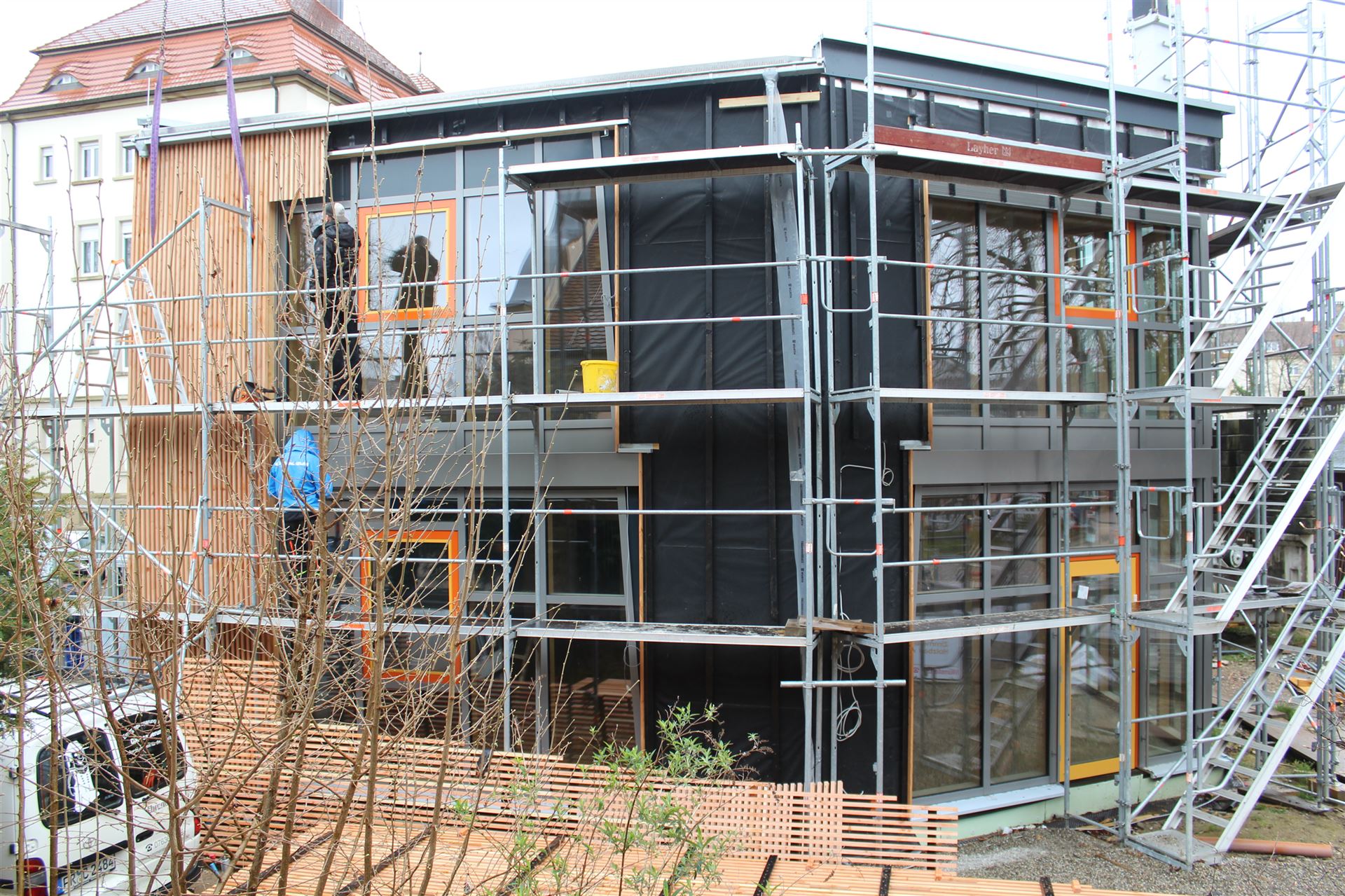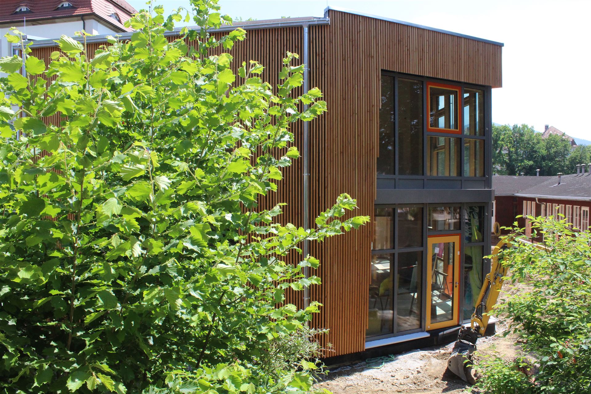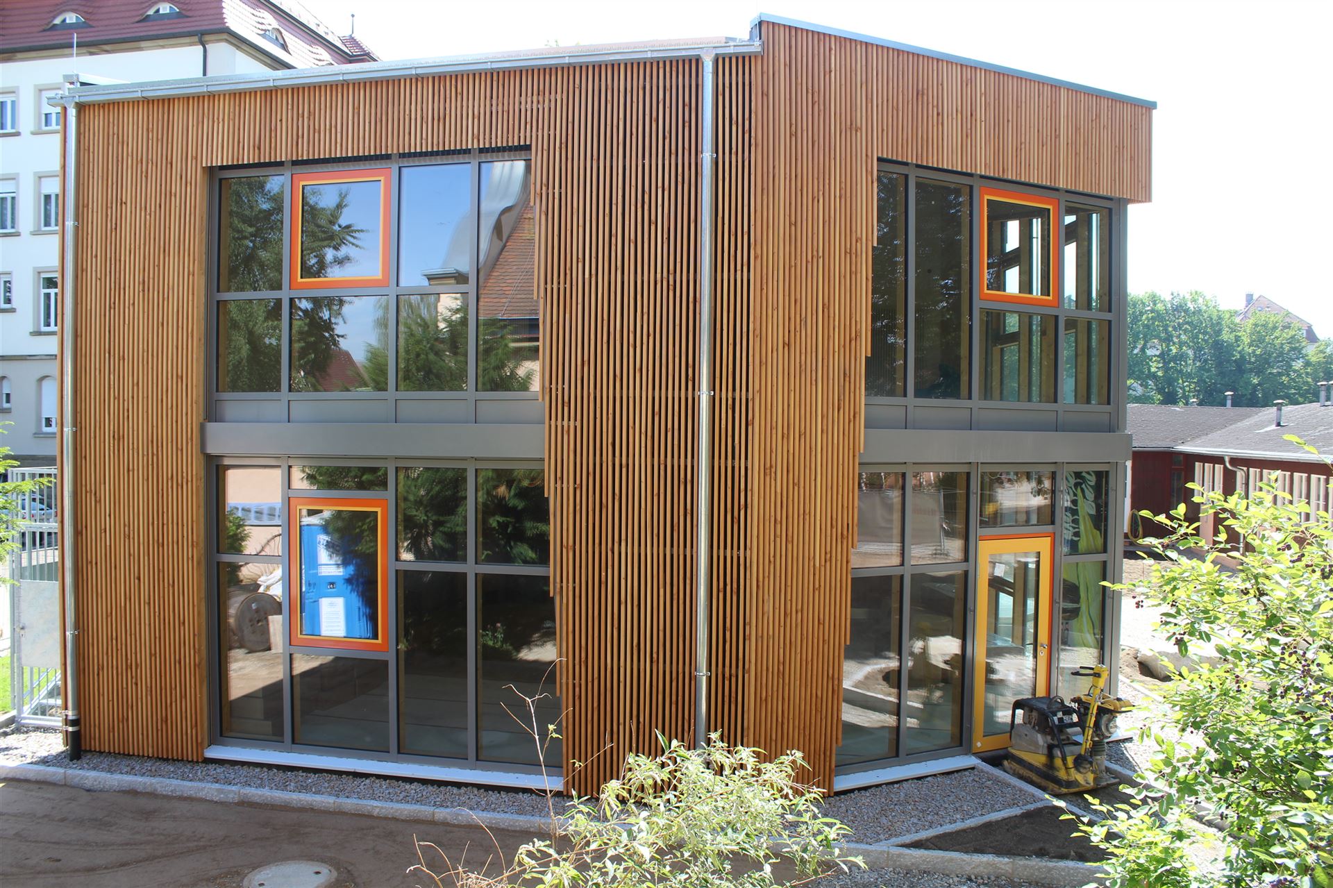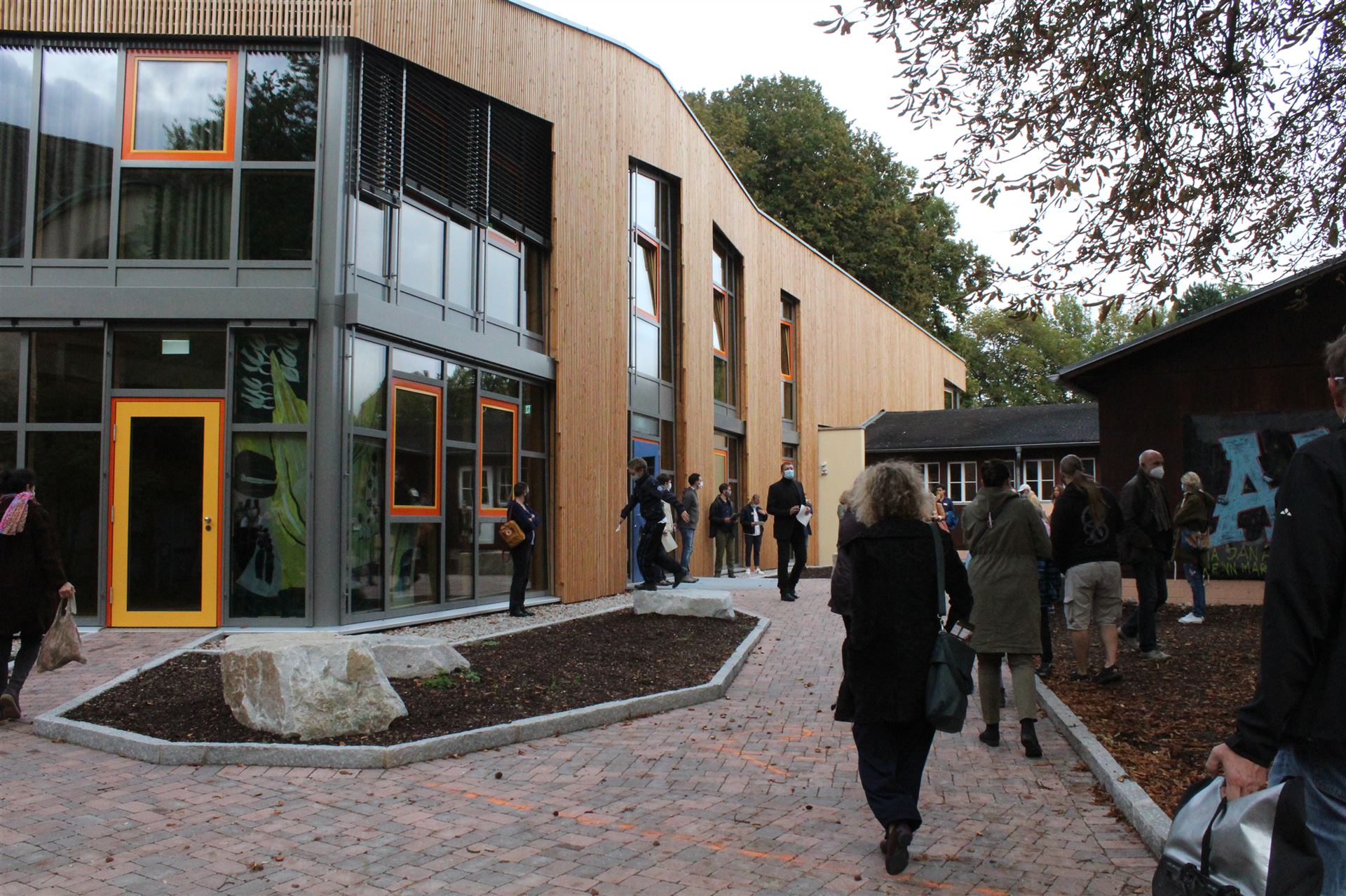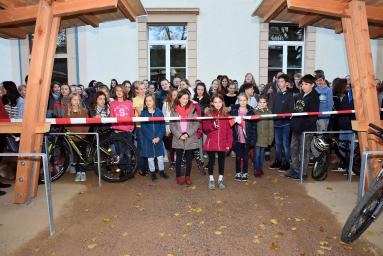 Da zu jedem Schulneubau genügend Fahrradstellplätze vorhanden sein müssen, begann im Sommer 2018 der Startschuss für das erste Bauvorhaben: Die 60 neuen Fahrradstellplätze wurden hinter der Mittelstufe errichtet und nach den Herbstferien feierlich eingeweiht.